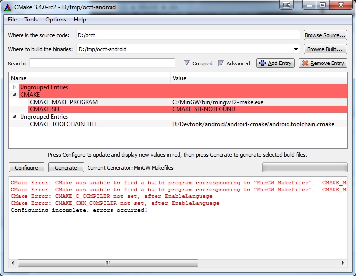 某些变量的状态更改可能导致新变量的出现。配置过程遍历后出现的新变量将由CMake GUI工具以红色突出显示。